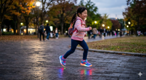 親御さんにとって、光る靴の最大のメリットは「安全性の向上」でしょう。夕暮れ時や夜道、雨の日などの薄暗い時間帯でも、子供の足元が光ることで、車や自転車、他の歩行者からの視認性が劇的に高まります。遠くからでも子供がいることがわかるため、交通事故や不審者による犯罪を未然に防ぐ効果が期待できます。子供にとっても、「履くと光る」体験は魅力的。靴を履くのを渋っていた子供が、進んで履くようになったという声も多く、楽しみながら靴を履く習慣が身につき、自立を促すきっかけにもなるのです。